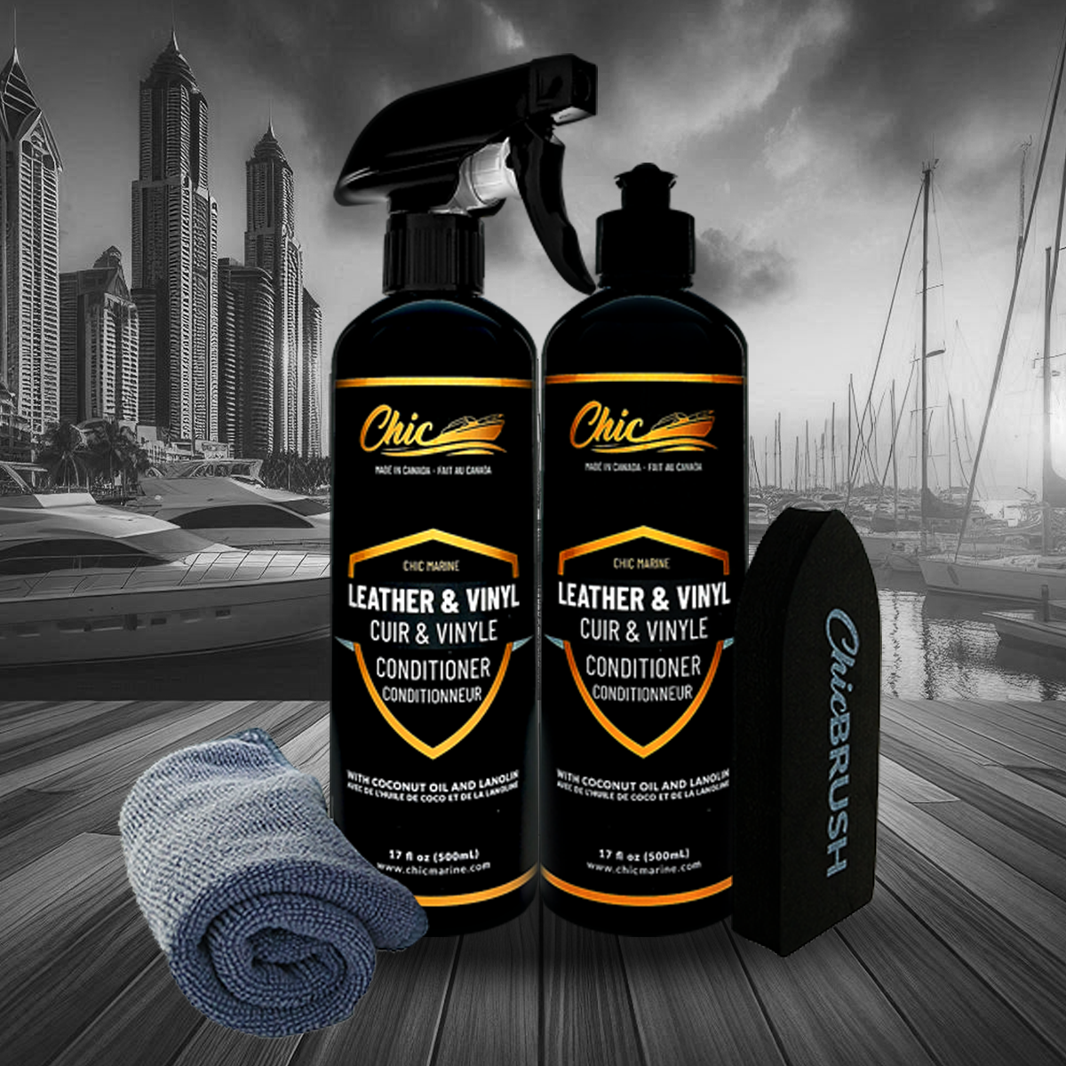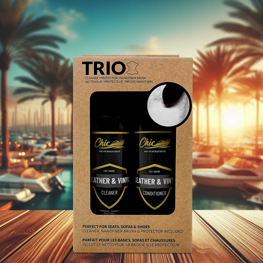 This all-in-one boat seat care kit includes a leather and marine vinyl cleaner, a premium conditioner/protector, and a nanofiber cleaning brush. Once you have tried the nanofiber brush, you will no longer be able to do without it. The combination of our cleaner and nanofiber brush will exceed your expectations. Moreover, our leather and marine vinyl conditioner/protector contain pur lanolin and coconut oil. It protects, shines and prevents the appearance of mold. This set gives the best value on the market. Satisfaction guaranteed or money back.